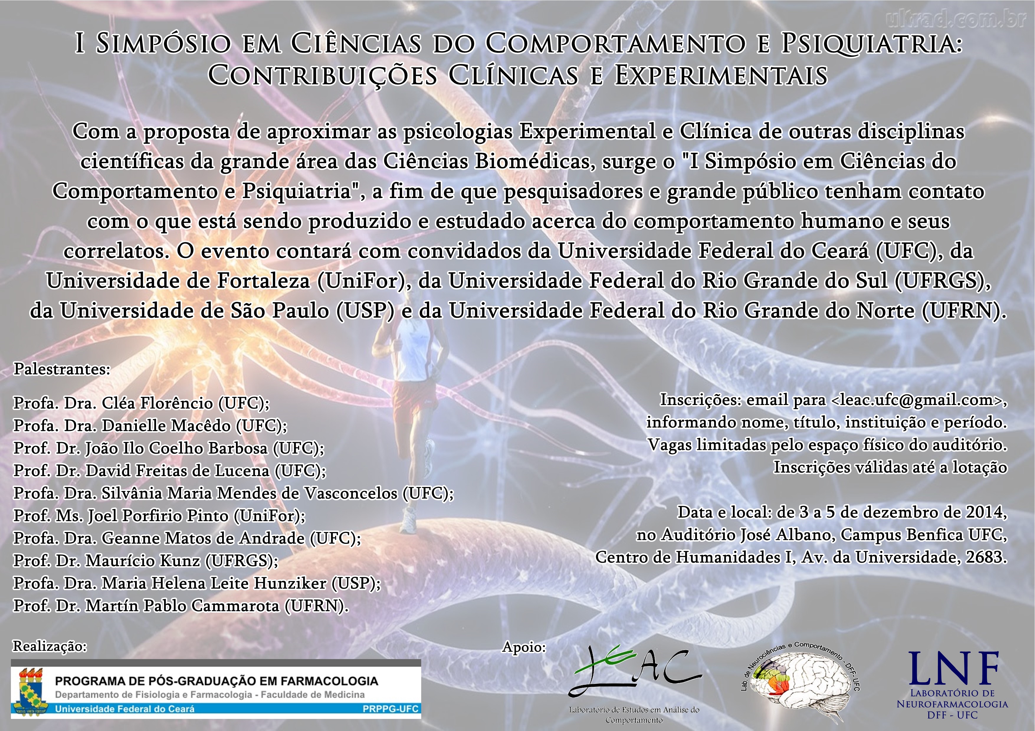 As inscrições são feitas exclusivamente pela Internet. Outras informações podem ser obtidas pelo e-mail [email protected] ou na Coordenação do Curso de Iniciação Científica, situada no DFF. Prof. Roberto César P. Lima Jr., do Departamento de Fisiologia e Farmacologia da UFC - Fone: 85 3366 8588